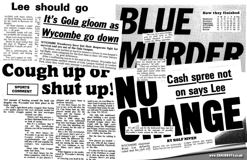 Wanderers’ debut season in the national Gola League culminated in one of the low points in the history of the Club - relegation back to the Isthmian League after just one season competing against the elite of non-League football.It was a shock and disappointment for Wanderers fans at the time, not least because for the majority of the season the team looked comfortably placed in the league, had beaten Football League opposition in the FA Cup for the first time in 11 years, reached the Quarter-Finals of the FA Trophy and progressed to the Final of Berks & Bucks Senior Cup. League form had been erratic but Wanderers had still managed to beat Champions Enfield home and away during a season where the North London side has lost just five Gola League games all season. However, the mass of games (62 competitive First Team fixtures throughout the season) eventually took its toll on the limited resources being afforded to the Management team. Paul Bence had begun the season as Manager but quit in January 1986 due to work commitments. The Managerial reigns were handed to previous Assistant Alan Gane, with former Wanderers goalkeeper John Maskell bought in by Gane as his Assistant. As the season reached its climax, Wanderers needed a single win from their remaining two games of the season – both at home – to secure safety in what had obviously become the absolute minimum level of football that Wanderers and the town of High Wycombe should be competing at. On the Wednesday before the final Saturday of the season, Wanderers contrived to lose 1-0 at home to an Altrincham side with a clear eye on an FA Trophy Final tie at Wembley just over two weeks later. The recollection of the winning goal will still pain those who were amongst the 544 at Loakes Park to see it – a spectacular 79th minute 30 yard lobbed own goal from defender Graham Pearce.