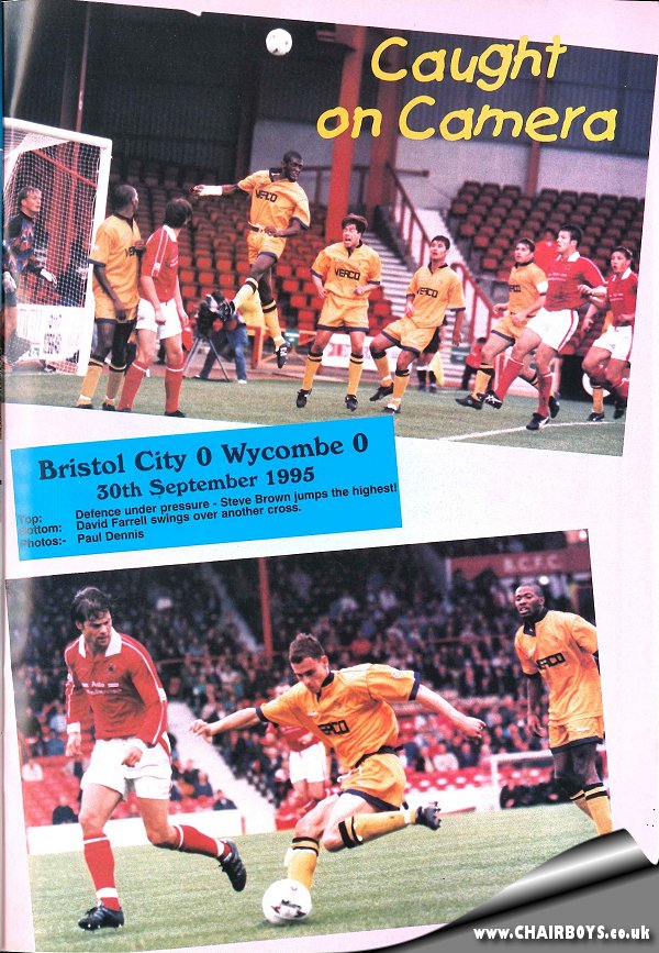 Bristol City 0Wycombe Wanderers 0 Saturday 30th September 1995 Football League Division Two Wanderers extended their unbeaten run in the League to seven games but were left rueing missed chances from their first ever visit to play Bristol City at Ashton Gate. The game ended 0-0 after Manager Alan Smith made one change to the side that had drawn 1-1 at home to Wrexham the previous weekend - Gary Patterson returning to the side after Wimbledon loanee Stewart Castledine returned to his parent following following the end of his month with the Wandeders. The draw in Bristol left Wanderers in 11th place in table with all eyes now set on the midweek 2nd Leg Football League tie away to Manchester City. Reporting for the Bucks Free Press from Ashton Gate, Claire Nash said: Wycombe Wanderers’ goalkeeper Paul Hyde was the hero of Saturday’s game when Blues extended their unbeaten run to eight games. Hyde suffered a nasty clash in the first half, which grounded him for five minutes. But he carried on and even pulled off a dramatic save in the dying seconds. The clash, after 20 minutes of play, looked so serious that the referee called for a stretcher, as the physio attended to the stricken goalkeeper. Hyde went down, much to the horror of Blues’ supporters, after he came off his line to challenge an advancing Bristol City forward. The Bristol player was booked. Blues’ showing on Saturday was proof that they are in good enough shape to cause the upset of the Coca-Cola Cup second round against Manchester City, after extending their unbeaten run. Their hard-grafting performance secured a point at Bristol to keep Alan Smith’s plan of establishing a steady platform for success ticking over. While Wycombe continued their good run in disciplined fashion at Ashton Gate, [Manchester] City went down 3-0 at Nottingham Forest.