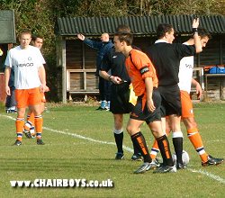 ![]() For some unknown reason Wanderers turned up with an all orange kit to play Colchester. Unfortunately Colchester turned up with orange shirts too. Never mind, Wycombe started the game in white t-shirts. |