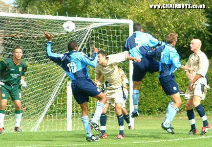 Wanderers No.5, Stuart Hole, goes close with this header against Pompey.