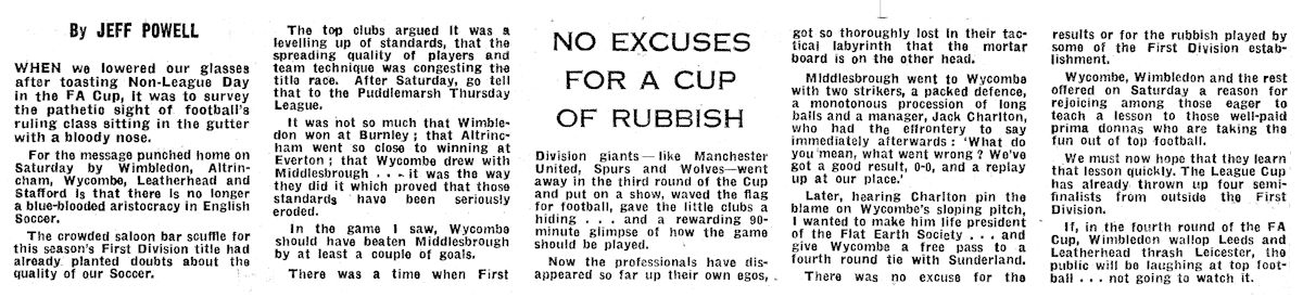Former England International cricketer and now journalist Denis Compton said: Middlesbrough failed miserably to overcome the notorious slope and adjust their play to its subtlties. We all thought the referee blew the final whistle three minutes short of time, and when after the game, this was nisnetioned to Jacky Ohariton he immediately replied: "Thank God for that." Lance Masters said "Three gentlemen perched preceariously on a gasometer, many more watching from a hospital overlooking the ground, and a capacity crowd of 12,000 witnessed the huge embarrassment of Middlesbrough wobbling from one crisis to the next. It was an astonishing performance, full of fire and conviction, by the Rothmans Isthmian League champions, which poked fun at the much quoted assertion of their thanager, Brian Lee, that his team had “no chance.” The notorious Loakes Park slope, which tilts the pitch like a ski run, cannot be used as an excuse by Middlesbrough for the litter of mistakes and lack of compelling rhythm that marked their inept challenge. Jeff Powell, Chief Soccer Correspodent for the Daily Mail also laid into full-time professionals in general after a day when Wimbledon had won at Burnley, Altrincham drew at Everton, Leatherhead had beaten Brighton and Stafford Rangers held Rotherham. He said: In the game I saw, Wycombe should have beaten Middlesbrough by at least a couple of goals. There was a time when First Division giants - like Manchester United, Spurs and Wolves - went away in the third round of the Cup and put on a show, waved the flag for football, gave the little clubs a hiding... and a rewarding 90 minute glimpse of how the game should be played." He added: "Wycombe, Wimbledon and the rest offered on Saturday a reason for rejoicing among those eager to teach a lesson to those well-paid prima donnas who are taking the fun out of top football." ![]() But as the dust began to settle following the first tie at Loakes Park, Boro boss Jack Charlton began to place more blame on the sloping pitch at Loakes Park. The former Leeds and England defender said: "The replay will be so different. I give Wycombe no chance. I wouldn’t back them with bad money. All right, we didn’t play well but then it is impossible to play well on this ground, When you hit a ball down the hill it goes out of play. When you hit a ball up the hill, it slows down and stops. The only way to do it is to kick and chase, and that is not our game. That is Wycombe’s game and all we could do against it was keep back behind the ball.” Frank McGhee of the Daily Mirror commenting on Charlton's excuses said: In all the many years I have know Charlton he has always been honest, sometimes brutally, self destructively honest. But I can’t help wondering whether he is deluding himself this time. It feel that the real truth is too many Middlesbrough players allowed that slope to loom like a mountain in their imaginations from the moment they walked out an hour before the match. A day before the replay, Charlton went on to say: “I honestly believe it is degrading for professional footballers to have to play on a pitch like Wyconibe’s. We took a lot of hammer from the critics on Saturday because we only managed a goal-less draw. Yet in truth it was magnificent achievement.