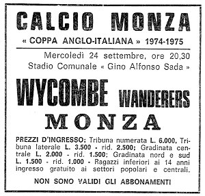 Wanderers' first European cup game Wednesday 24th September 1975 A.C. Monza 1 Wycombe Wanderers 0 Anglo-Italian Trophy - 1st Leg (First published by chairboys.co.uk on 24th September 2015)