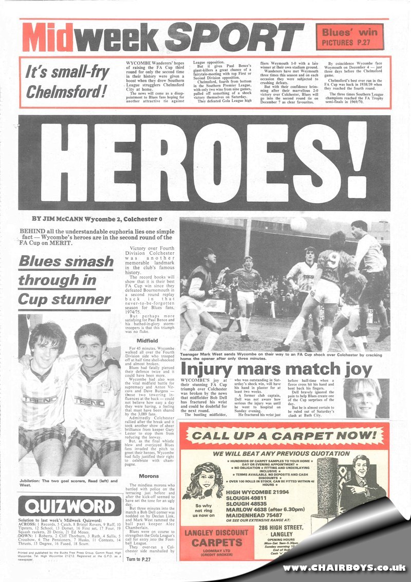 ![]() Above - Wycombe v Colchester - Match report and pictures from Bucks Free Press Midweek - click to enlarge in new window. The draw for the Second Round pitted Wycombe at home to Southern League Chelmsford City on 7 December 1985. The Essex side had beaten Weymouth 1-0 in the First Round and Bence was wary over the draw - reminding people that Wycombe had already failed to beat fellow Goal League side Weymouth on three seperate occasions that same season. He added: "It would have been nice to have drawn Reading at home. The FA Cup is a great opportunity for non-League clubs to grab a bit of glory — so we are going to enjoy it while it lasts." |