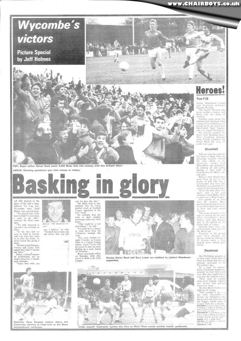 Wanderers beat Football League opposition in the FA Cup for the first time in 11 years after overcoming Fourth Division Colchester United at Loakes Park on Saturday 16th November 1985. It was also only the third occasion Wycombe could claim to be 'giantkillers' having disposed of Newport County in the First Round in 1973 and Bournemouth in the Second Round in 1974.The tie came during Wanderers' first ever season in the national 'Gola League'. Paul Bence's side had found it tough going in their debut season - lying in 14th spot prior to the meeting with The U's - and the Cup provided a welcome distraction. Burton Albion had been disposed of in the 4th Qualifying Round to ensure that Wanderers entered the competition proper for the 12th time out of the 13 previous attemptd. Meanwhile, Football League Colchester came into their first ever meeting with Wanderers on the back of four straight defeats that had sent them tumbling from the top spot in the fourth tier of the Football League, to 8th place. The attraction of seeing Football League opponents at Loakes Park for the first time since in five years swelled the gate from the League average of just under 1,000 to more than 3,000 - this despite the cost of terrace ticket rising from the usual League charge of £1.50 to £2. Unfortunately the tie attracted an unruley element that saw Police contend with trouble before, during and after the game. The Police made five arrests (mostly from the High Wycombe area) and more than 40 spectators were ejected from the unseggregated crowd. For the Wanderers fans, with many congregated behind the 'Gasworks End' goal, the tie got off to a dream start when on 3 minutes an 19 year old Mark West rose to head in Declan Link's nod on from Bobby Dell's corner. The Essex side were now on what is traditionally termed in giantkilling circles as 'on the rack'. Five minutes before the break Simon Read added a second for Wanderers when he took advantage of a Andy Farrell slip to smash home left footed following a Neal Stanley ball from the right. The terrace celebrations were even more manic than those following the first goal. Wycombe had efforts by Des MacMahon and West cleared off the line on the stroke of half-time before former Manchester United defender Stewart Houston (and former teammate of Paul Bence at Brentford) looked to help Colchester make a second-half revival. However The U's found home 'keeper Gary Lester in superb form. Three times Lester blocked out efforts from Tony Addock and Tong English with his feet to ensure it was Wanderers who progressed and spark a pitch invasion at the final whistle by many Wycombe fans.