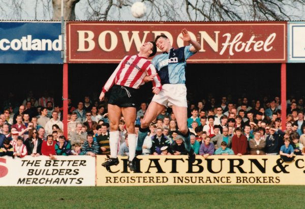 Glynn Creaser in an aerial dual with Ken McKenna. Picture by and with thanks to Steve Peart - published for the first time for the 25th anniversary. |