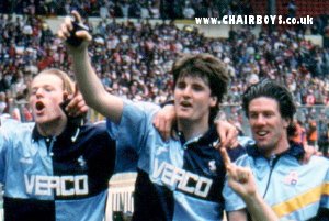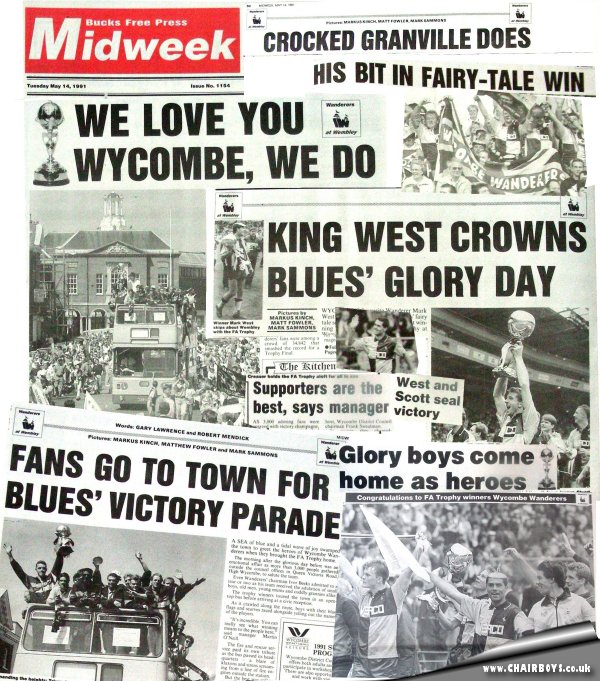 Kidderminster Harriers 1Wycombe Wanderers 2 Saturday 11th May 1991 FA Trophy Final - reaction (research, memories and words by Paul Lewis - first published during 2015/16 to mark the 25th anniversary) Wanderers' victory in the 1991 FA Trophy Final brought probably the biggest peace-time celebrations seen in High Wycombe to that date. An estimated 25,000 Wycombe fans travelled to see the meeting with Kidderminster Harriers at Wembley on Saturday 11th May 1991 and went to make up a then record Trophy attendance of 34,842. There was an out pouring of emotion at the final whistle and when all that was done it was back to High Wycombe for the more personal celebrations to take place. These went on deep into the night as the revellers frequented the likes of town centre pubs including, The Flint Cottage, The White Lion, The Hobgoblin, The Antelope and The Bell. The following afternoon it was back to town again for a celebration procession that started at Wycombe Marsh and culminated in the players and officials coming out on the Council Offices' balcony in Queen Victoria Street. ![]() What they said: Martin O'Neill: "I’m absolutely thrilled, thrilled to bits. We all thought it was going to be a difficult game. Kidderminster have a lot of talented footballers in their side especially going forward and they caused us monumental problems. They played very well just before they got the equaliser. What I was really pleased about was the bit of resolve and resilience that we pulled together again to score what I would call a classic FA Trophy winning goal. It’s all about scoring goals and I don’t think that there was that much between the two sides. We got started very well and got the goal at an early stage and that helped us. I felt just before half time that they were beginning to wear us down."Graham Allner (Kidderminster Manager): “Wycombe’s first goal was dubious. Indeed, I would like to see both the Wycombe goals on video to see if they were offside, but we have no complaints about the result." Allner then added: "We had a chance when we got the equaliser but I felt we were always second best and always at full stretch. When we got the goal I thought that might just give us the impetus to knock them down. As it turned out they got the next goal and that was always going to be the winner. I’ve got no complaints about the result. In the end we weren’t quite good enough. We didn’t fire on all cylinders but that’s probably because Wycombe could handle us." Wanderers' Captain Glyn Creaser went up to collect the Trophy donning a red and white Kidderminster cap given to him as he climbed the famous Wembley steps. The Trophy was presented by guest of honour, former England and Liverpool goalkeeper, Ray Clemence. Creaser said: "I just felt numb. I said to [Ray Clemence], ‘Can we compare noses now?’" The 31 year old, playing his first match at Wembley, went on to reveal that his father was watching him play football for the first time. "I never started playing till really late in my career, and he was always working and not getting any younger. His brothers came along, and lots of my family and friends were here." Creaser added: “[Ray Clemence] mentioning my old man was tremendous. But I’ve not done it for him, I’ve done it for me, for Martin, the Chairman, the Club. Everything they’ve done in the last two or three days has been done right — the build up and everything." The Wanderers Captain also put on record the numerous faces behind the scenes. “People like the chairman, John Goldsworthy, JR (John Reardon), Rod (Lavers, the groundsman), and Wally (Steve Walford). Rod, like John Reardon, has taken so much stick through the season, but they’re tremendous. Wally’s been here before and done it, but he’s always got time to listen and talk to you about things," said Creaser. Steve Guppy was picked out by Glyn Creaser as man of the match, and Guppy asserted: “I wasn’t happy with that seven out of ten in the Bucks Free Press. I’ll put the team down for ten out of ten today. It was a wingers’ game, and I got a lot more of the ball in the second half and got a few crosses in. And now we’re in the European Cup Winners’ Cup!"