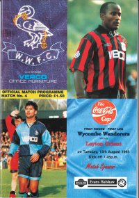 Wycombe Wanderers 3Leyton Orient 0 Tuesday 15th August 1995 Football League Cup 1st Round 1st Leg Wanderers opened up a three goal 1st Leg advantage over Leyton Orient following the First Round Football League Cup encounter at Adams Park. Two goals inside the opening 20 minutes by Miquel Desouza and a second-half effort from Matt Crossley meant Wycombe would travel to Brisbane Road the following Tuesday with one eye already firmly on the seeded Second Round draw. Team news had seen Manager Alan Smith stick with the same starting XI that had drawn with Crewe Alexandra on the opening day of the campaign - central defender Mark Foran, on loan from Sheffield United continuing at the back ahead of former Orient hero Terry Howard. Reporting for the Bucks Free Press from Adams Park. Claire Nash said: Miquel Desouza is undoubtedly one of the top dogs in the shop window after his scorching double gave Wycombe a commanding 3-0 first-leg lead in the Coca-Cola Cup first round. But how much for someone who is such a key figure for Wycombe’s promotion and cup campaigns? He already looks priceless. With his eighth and ninth goals in almost as many starts by the club, the sharpshooting 25- year-old put Blues in the driving seat against Leyton Orient at Adams Park on Tuesday. The manner in which he scored left everyone in the house drooling. His boss was no exception. “You won’t get better goals in the Premier League,” said Alan Smith afterwards. Desouza’s display gave a host of visiting scouts plenty of food for thought. It also impressed Barry Hearn, the boxing and snooker impresario who took over ownership of Leyton Orient late last season. “They were two good strikes. He did very well,” said Hearn in confirmation of Desouza’s mighty body blows to Orient’s cup hopes. Matt Crossley added a third to complete a confidence-boosting night for Wycombe. A more accomplished all-round team performance helped banish an unsteady opening to the new League sea son and, barring a disastrous hiccup in Tuesday’s second leg, should see them in the next round and a potential tie against a Premiership club. The Coca-Cola clash, in front of a 3,300 crowd, was a million miles away from the high drama of Smith’s most recent experience of the competition, with Crystal Palace in last season’s semi-finals. But with Blues endeavouring to strive forward into his brave new world, the stakes are no less high. The journey will not be straight forward, but Wycombe’s style of play on Tuesday suggested that they are capable of establishing an encouraging platform. Desouza brought the visitors’ bright opening screeching to a halt when he scored two goals in eight minutes. His first, conjured out of nothing, saw the striker chest down a speculative ball forward before turning and letting rip with a supreme 25-yarder which took a deflection on the way past a hapless-looking Peter Caldwell on 11 minutes. Desouza’s second was even better, a deadly drive from the edge of the box after a short pass by Steve McGavin. Wycombe would certainly have won by a far greater margin if not for Caldwell’s superb goalkeeping display for Orient in the second half. The pressure was relentless after Orient’s Ian Hendon was sent off for his second bookable offence on 58 minutes. But Caldwell frustrated Blues by tipping Mickey Bell’s chip over the bar on 66 minutes; parrying Dave Carroll’s vicious curler two minutes later and blocking Crossley’s close-range header on 74 minutes. Captain Steve Brown, at the heart and soul of Blues’ effort, had a goal disallowed for pushing. But Crossley stole in unmarked to thump home a Carroll corner flicked on by fellow central defender Mark Foran on 76 minutes. Wycombe retained their stranglehold, with the defence and goalkeeper Paul Hyde neatly tidying up any late trouble.