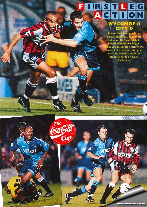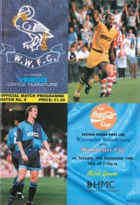 Wycombe Wanderers 0Manchester City 0 Tuesday 19th September 1995 Football League Cup 2nd Round 1st Leg Wanderers gave Premiership strugglers Manchester City and their underfire Manager Alan Ball a fright after going close to gaining a 1st Leg advantage in a Football League Cup Second Round tie at Adams Park. Ball's side left High Wycombe with a 0-0 draw having had just one shot on target throughout the ninety minutes, while Alan Smith's side were left debating whether Miquel Desouza's headed effort in the second should have stood. Wycombe had earned the right to take on City following an aggregate win over Leyton Orient in the previous round. Team news saw Steve Brown return to the midfield in place of Wimbledon loanee Stewart Castledine, while new signing John Williams was given his home debut having signed from Coventry City the previous week for £150,000 and debuted in Wanderers' 1-1 draw at Stockport County the previous Saturday. Reporting for the Bucks Free Press from Adams Park, Claire Nash wrote: Quite frankly, Wycombe Wanderers must be kicking themselves for not making life more uncomfortable for Manchester City at Adams Park on Tuesday night. They were unlucky not to have secured a one-goal lead to take up to Maine Road for the second leg of this Coca-Cola Cup second round on Wednesday, October 4. But on a night when the world weighed heavily on city boss Alan Ball’s ever-sagging shoulders, Wycombe know that they should have twisted the knife. City’s supposedly-Premiership players put up a performance which was anything but. A bizarre theory was proffered by a City clubcall reporter who repeatedly told the folks back home in Manchester during his broadcast that the grass at Adams Park was a lot shorter than their players are used to. A desperate explanation for a desperate side. Wycombe, meanwhile, gave as enthusiastic a display as they have in their better League showings so far this season. But it wasn’t the best we’ve seen from Blues this term, even taking into account the level of the opposition. There were a handful of ‘if onlys’, which may become the most telling incidents of both legs for either side. Wycombe would have had City on the rack if they were given the penalty they deserved after 14 minutes. Miquel Desouza’s dangerous surge into the box was curtailed when Richard Edghill tripped him. But referee Mick Pierce wasn’t interested and added insult to injury by booking the incredulous striker for diving. Then there was the controversial disallowed goal in the second half. Desouza thought he had scored after heading in a high ball which he jumped for with City goalkeeper Eike Immel. But Pierce, in agreement with his linesman, said it didn’t count because the Wycombe striker knocked it out of Immel’s hands. Desouza maintained afterwards that the goalkeeper punched his head rather than the ball.