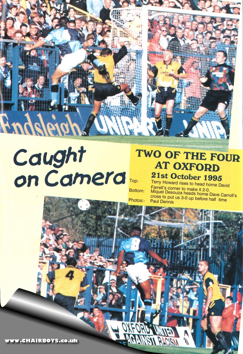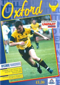 Oxford United 1Wycombe Wanderers 4 Saturday 21st October 1995 Football League Division Two Wanderers blew away Oxford United by 4 goals to 1 in what was described after the game by the local Oxford press as the 'Massacre at The Manor'. The U's went into the meeting a point behind Wycombe and were hoping to avenge the previous season's double defeat in the first ever League meetings between the two sides. Meanwhile, Wanderers were unchanged from the side that had beaten Walsall at Adams Park the previous weekend and were also looking to extend their unbeaten run in the League to ten games. It all started to go wrong for the Headington based club on 17 minutes when David Farrell swung a corner in from the right that eluded all and ended in the back of the United net. Fifteen minutes later, Farrell pulled a similar trick, this time swinging his corner to the far post where Terry Howard jumped highest to head home and send the 2,300 Wanderers fans craning to see over the 10 foot high plus fences into a frenzy. The celebrations hardly had time to settle before Miquel Desouza added a third on 36 minutes. Denis Smith's side rallied briefly after the break - pulling a goal back though David Smith - but a Steve McGavin penalty on 79 minutes, following a foul on Dave Carroll, sealed an emphatic victory for Alan Smith's side who climbed to 7th place in the table as a result - three points off the play-off spots. Reporting for the Bucks Free Press, Sharron Walters wrote: 'One spectacular goal and the setting up of another by David Farrell sent Wycombe Wanderers on their way to a brilliant derby win over Oxford. Farrell was the unlikely hero of Saturday’s clash with United when he scored straight from a corner 17 minutes into the match. After the game the mid-fielder said that an advertising board, of all things, had helped him secure the flukey goal that whistled past a packed area. “I didn’t have very much of a run up on the ball because of this board and thought about moving it. I decided it would be too heavy, so I just took the corner, kicking half the floor up with it and it just went in,” he said. Sixteen minutes later another Farrell corner sent a murmur of excitement around the ground, and he didn’t disappoint. This time, however, he did move the board and it paid off beautifully. Terry Howard standing at the far post, rose head and shoulders above the pack to put away Farrell’s pin-point cross. “A goal like that doesn’t happen often, so when it comes off, it’s great,” added Farrell. Blues started the game in convincing style with much of the possession and the majority of the chances. Despite the lucky nature of the first goal, Wycombe had looked up to scoring from the start. Indeed, on nine minutes Mickey Bell headed the ball down at close range, only for Whitehead to stoop to the challenge and collect the ball. Seconds later, Miquel Desouza produced an even better shot that was scrambled off the line by an edgy United defence. Twelve minutes into the half, Williams managed to get a shot in after a one-two with Carroll only to see it cleared away by United defender Les Robinson. On Saturday, Wanderers went a long way to answering their critics, especially in the first half, with steady defending and jumping on opportunities that came their way. Oxford were very quickly out classed by Wycombe, a fact their disgruntled supporters were only too aware of. The first half, if not the game, was wrapped up in the 36th minute when a Carroll cross, which completely eluded Williams, found Desouza who placed the ball high and left of Whitehead.Oxford started the second half in a manner that, suggested they had a fightback in mind and for a while it looked promising for them. They held on to possession for long periods early in the half, which eventually paid off when David Smith fired a shot in from close range. However, the goal seemed to jolt the Blues back into the game and although they had their chances, United produced little more than they had managed in the first half. There was no doubt who was in control and in the 81st minute the game was effectively put beyond United’s reach. Good work by Carroll as he went round one defender on the edge of the box unnerved United enough for Matt Murphy to bring the midfielder down with a late challenge. McGavin, from the spot, sent the ball right as the despairing goalkeeper dived left and the large contingent of Wycombe fans began celebrating another derby win after doing the double over Oxford last year. Perhaps the only disappointment of the afternoon for Blues’ supporters was the failure of Terry Evans to make it off the substitutes’ bench.