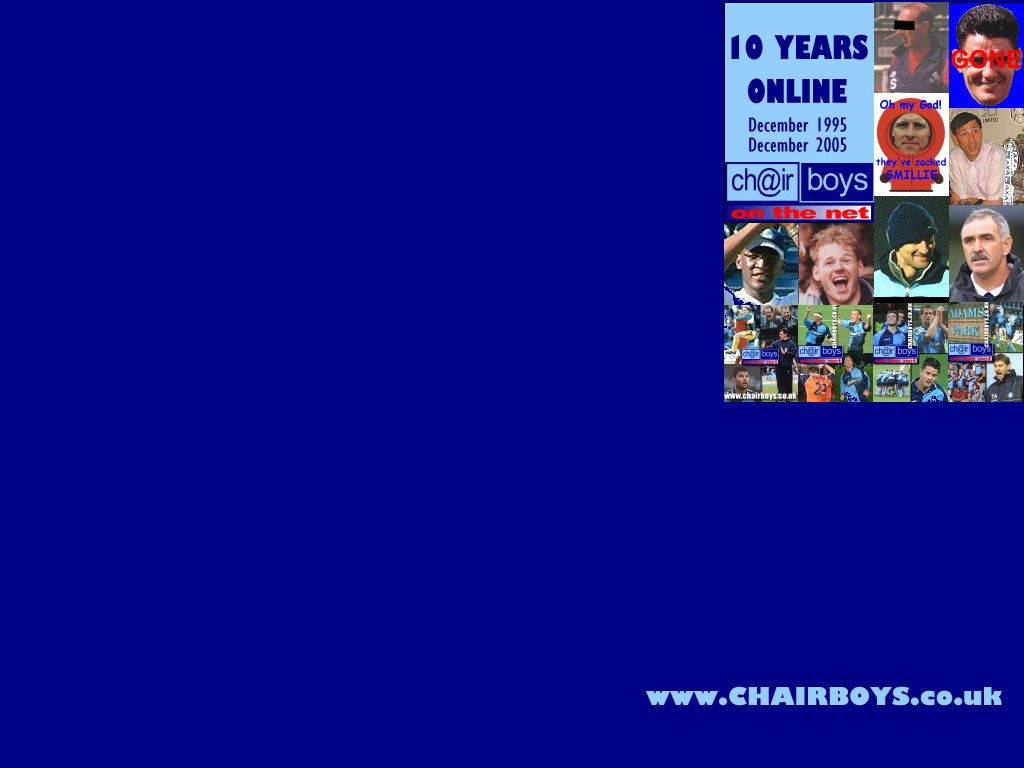 So that was Chairboys on the Net in the beginning. Fast forward to December 2005 and two more managers have gone and in the true Wycombe Wanderers tradition they were not your simple run of the mill sackings or departures. Hey, we even finally managed to get relegated - fourth time unlucky. Of course there was also the complex goings on 'off the pitch' and we could go on looking back at the intervening years but for nostalgia freaks the now established archives should provide a suitable fix. It would be a fair bet that the next major story is not too far away and Chairboys on the Net will hopefully attempt to continue to provide an independent commentary on this and other stories as they unfold.Thanks to all those who have contributed in any way to the site over the past ten years and here's hoping that some day in the not too distance future we can celebrate an internet first promotion. Paul Lewis - Editor Download chairboys.co.uk ten year wallpaper (1024x768) Click here to read all the latest Wycombe news |