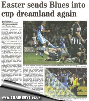 Wanderers made it through to the Quarter-Finals of the League Cup after a tense fought 1-0 victory at Notts County. In an even game, where both sides had numerous chances, the vital goal came in the 49th minute when Jermaine Easter forced the ball home following a left wing cross from Scott Golbourne that County 'keeper Saul Deeney couldn't hold. Meanwhile, Wanderers 'keeper Ricardo Batista kept Wycombe ahead with two late saves.Vicory at Meadow Lane came after Wanderers boss Paul Lambert was forced to re-shuffle his side again due to a suspension to central defender Will Antwi - sent off in the previous Saturday's game at Shrewsbury. Meanwhile, midfielder Tommy Doherty remained unavailable (serving the final game of a three match ban for a red card at Boston) but Stephan Oakes returned to the side after completing his three match ban for a red card against Doncaster. First clear cut chance of the evening at Meadow Lane came on 4 minutes when Matt Bloomfield saw Deeney dive full length to tip a chance around the post. Tommy Mooney also headed wide from a Kevin Betsy right wing cross as Wanderers showed their intentions were not to sit back. Mooney went even closer moments later with a downward header from eight yards that Deeney managed to block and then react again to deny the follow up from Betsy. At the other end Junior Mendes blasted County's best chance in the first-half over the cross-bar before Ricardo Batista had the home fans gasping as he produced saves to deny ex-Wanderer Gary Silk and Mike Edwards. After the impressive display from both 'keepers in the first-half it was an error that led to the crucial goal. Four minutes after the re-start Deeney fumbled a Scott Golbourne cross the near post and Easter was on hand to convert the loose ball for his 12th goal of the season and also continue his record of scoring in every round to date. The 800 travelling contingent for Wycombe went wild. Bloomfield, Easter and Mooney all came close to extending Wycombe’s lead but Deeney kept the home side in the tie to set up a grandstand finish as County went all-out for an equaliser. Veteran striker Jason Lee saw Batista claw away his header ten minutes from the end and then right at the death, Batista twice denied Martin before the final whistle set-up manic celebrations behind the goal at the away end. Wanderers' feat of reaching the last eight of the Football League Cup is the first time a team from the basement division has gone this far since Doncaster Rovers in the 1975/76 season. Opponents in the Quarter-Final for Wanderers were later confirmed at Charlton Athletic away from home. Final Score - Notts County 0 Wycombe 1